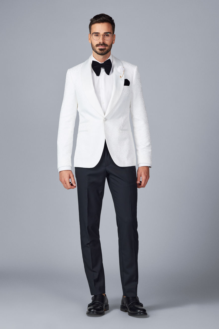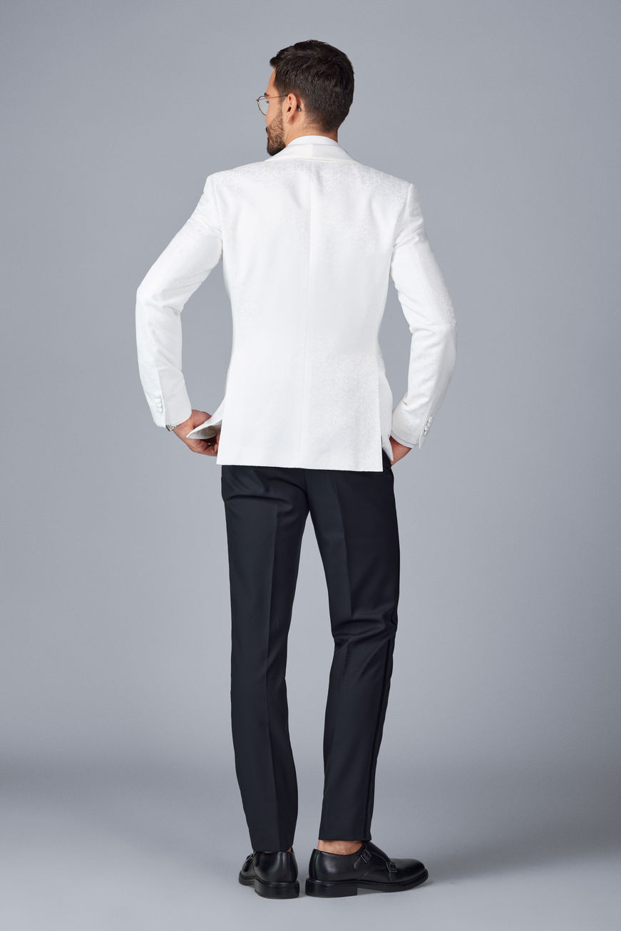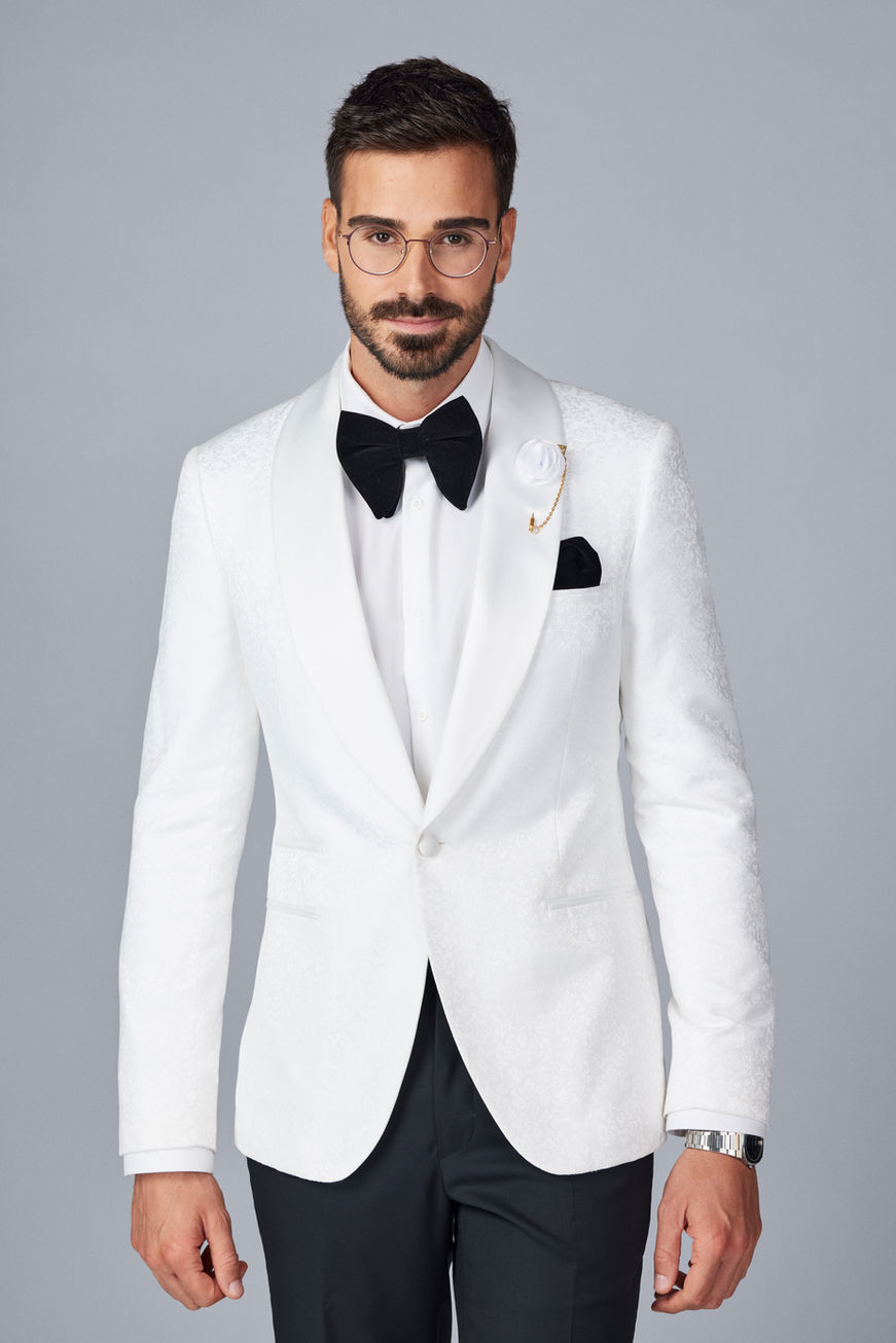 JACKET: European Slim fit | Normal shoulder | One covered button fastening | White shawl lapel | Welt pockets | Double vents | Floral brocade fabric